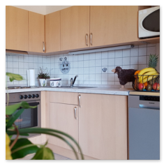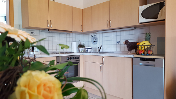 Vollausgestattete Küchenzeile mit 4 Platten-Umluftherd und Dunstabzug, Spülmaschine, Kühlschrank mit ***-Sterne Fach, Kaffeemaschine, Wasserkocher, Mikrowelle, Toaster