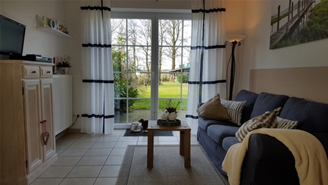 Unsere Wohnungen sind ebenerdig! Jederzeit können Sie über Ihre möblierte Terrasse die Liegewiese, den Spielplatz unter den großen Bäumen, die große Grillstelle und unsere Tiere besuchen.